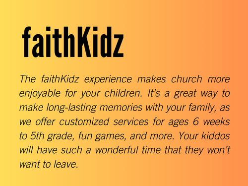 We extend an invitation for you to discover that 'MORE' for yourself. We have an extraordinary Resurrection Celebration in store for you that will delight the entire family. Bring your children along, but know this, they’ll absolutely enjoy their faithKidz experience and will remind you again and again until the next time you bring them back.